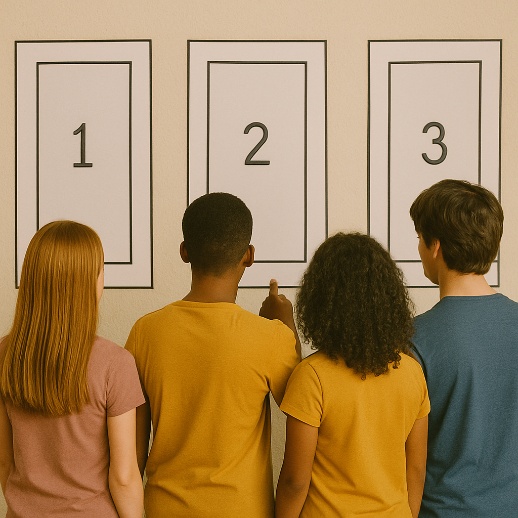 Monte três “portas” (pode ser com folhas A4 numeradas ou desenhos no quadro). Atrás de cada uma, há um desafio ou pergunta divertida. Exemplo: